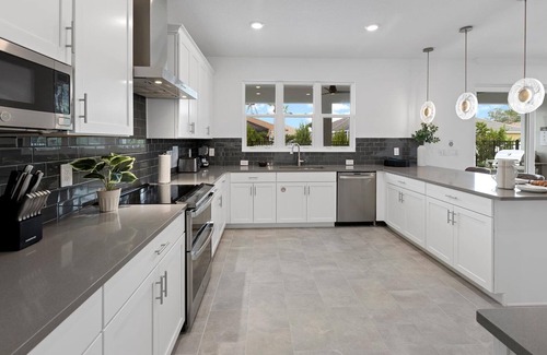 KITCHEN: After an active day on the beach or at Disney, you’re bound to have a hearty appetite—and this chef’s kitchen will be your go to. Whipping up a snack or feast is a pleasure with these stainless steel appliances, generous cabinetry and counterspace, black tile backsplash, and plentiful cooking gear and utensils. There’s even a breakfast bar for mini-meals, drinks, or hors d’oeuvres.