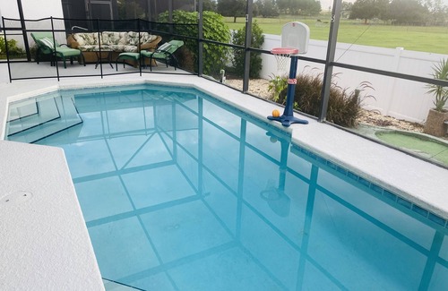 Four bedroom , two bath pool home near disney. Fully stocked with linens, bedding and dishes, cookware. Two Queen beds and one twin trundle bed , two twin beds that are bunk beds. Cable tv. , Roku, WiFi . Mini golf course in back yard behind pool. Covered lanai area to sit and enjoy being by pool even if its raining.