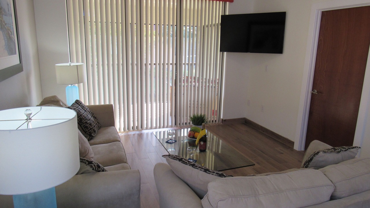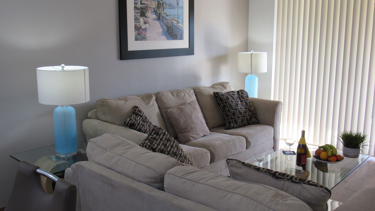A cozy living room with a wraparound couch, perfect for relaxing after a day of fun. Enjoy your favorite shows on the smart flat-screen TV or take a quick nap before heading out to the pool.