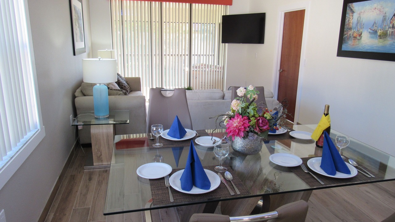 If you love to cook, the fully equipped kitchen has everything you need to prepare your favorite meals, with all-new appliances. For added convenience, you’ll also find a washer and dryer right next to the guest bathroom.