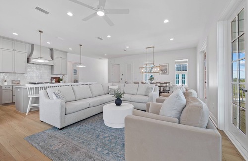 - Open-concept living area with a smooth flow into a modern kitchen.