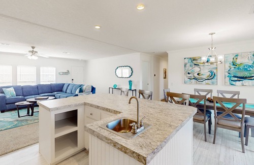 Equally bright and well-decorated, the four bedrooms are filled with natural lighting and a nautical-themed ambiance. When you need some time to yourself, head for the primary bathroom's soaking tub. Central air-conditioning, board games, books, a private washer/dryer, and internet access round out the home's interior perks.