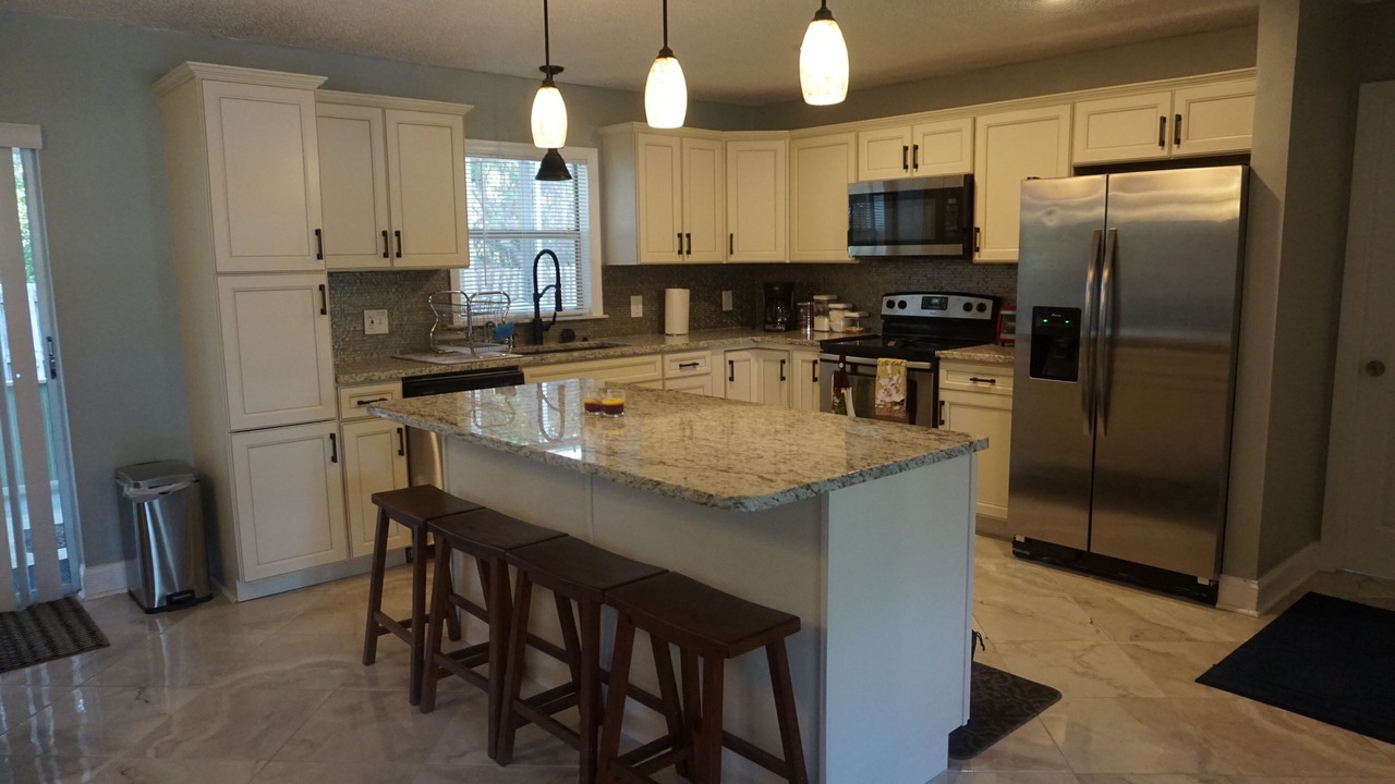 Lovely and private, 3 bedroom, 2 bath newly remodeled home in a quiet neighborhood for you to recharge and relax with family and friends. Enjoy sitting on the back porch, grilling some food, and then swimming in the saltwater heated pool. Comfortably sleeps 8. Home has a 2 car garage with 2 bikes included for you to enjoy. Street in front of home gives you direct access to a bike trail to the beach in 15 min or 5 minutes by car.