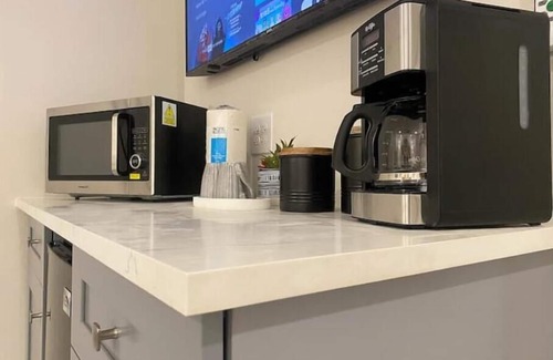 LOCATION, LOCATION, LOCATION. This brand new private suite comes with its own private entrance and parking. It is designed with your comfort in mind with KING SIZE BED, luxury bathroom, 55' smart TV and very fast WI-Fi. 10 min from beautiful beaches and 3 min from Downtown Gardens. Even though our suite does not have a full Kitchen, it's equipped with MICROWAVE/AIR FRYER, mini fridge and coffee maker.