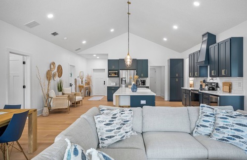 Newly built and designed for relaxation & family fun! This stunning canal-front retreat is your perfect getaway—just 10 minutes to the beach and close to St. Augustine, Daytona, and Disney. Enjoy the heated saltwater pool, fish off the private dock, or unwind in the 1,200 sq. ft. lanai with cozy seating & outdoor dining.