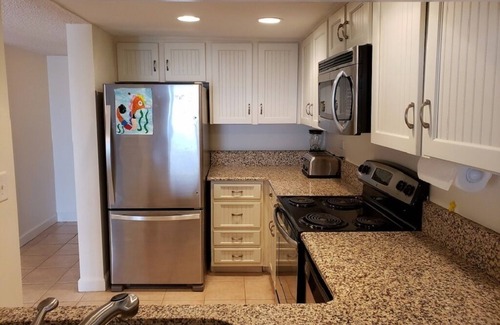 Mariner West is a family friendly low rise Condo that is Gulf front on Thomas Drive. This condo is a corner unit on the 3rd floor with an oversized balcony. The spacious Master Suite is furnished with a king size bed, private bath and a 43" Flat screen TV. Living Room is furnished with a Queen size Sleeper sofa, a 58" Flat screen TV , cable, complimentary wi-fi, and a DVD player. The kitchen is fully stocked with pots, pans, dishes, utensils, toaster, dishwasher, a regular coffee maker and Keurig, blender, and microwave. There is a separate laundry room with full size washer and dryer and room to store all your beach gear.