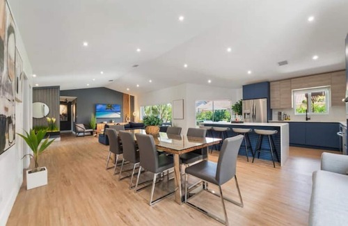 We invite you to enjoy a pleasant vacation in our newly renovated property in Miami, unique style and open concept and large spaces that will make you fall in love, located in a residential neighborhood, has 5 rooms with smart TVs in each room, memory foam mattresses, 3 full bathrooms, fully equipped kitchen, patio with heated pool, mini beach, pool table, bbq, everything you need for incredible vacations.