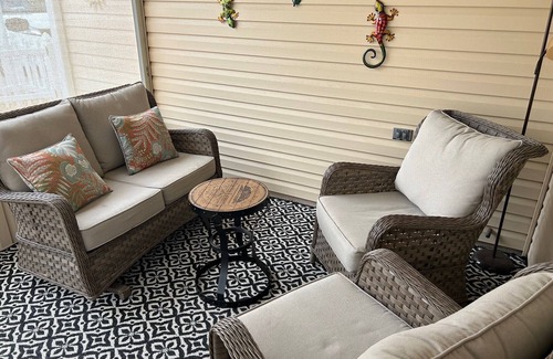The open-concept living and dining area features a reclining sofa set, a 65" smart TV, and a dining table for six. Step outside to the private patio with a gas grill and seating for four, or enjoy the screened-in lanai with cushioned seating and a glider loveseat—perfect for morning coffee or evening wine.