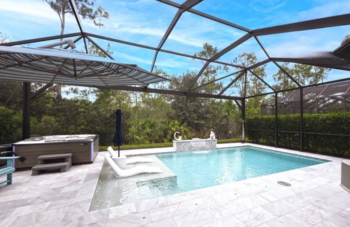 Welcome to your dream rental in paradise with this meticulously appointed home. Perfect for couples, professionals working from home and small families. With 3 bedrooms including 2 queen beds and 1 king bed, guests will have plenty of space to relax. The property also features 3 bathrooms with a shower, bathtub & soaking tub. The master suite has an en-suite bathroom and walk-in closet. Chef's kitchen featuring granite countertops, stainless steel appliances with plenty of seating for entertaining. An additional office space with 2 twin beds provides even more room for guests. Enjoy all that Naples has to offer when you stay at our relaxing home. Easy access to I-75, and all the superb dining, shopping and beaches that Naples is known for. Top rated gated community offers first class clay tennis courts, pickle ball, basketball, game room, lap pool, spa pool, children's playground and fitness center. Private screened lanai, beautiful heated saltwater pool and HotSpring outdoor spa offers the ultimate in relaxation to enjoy. Relaxing patio with fire pit will make evenings enjoyable. An outdoor grill and refrigerator make entertaining easy. Tennis racquets, pickle ball paddles provided. Property abuts a preserve for quiet relaxation.