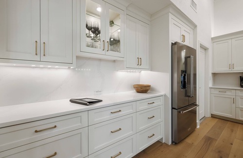 Primary bedroom offers a king bed, walk-in closet and private bathroom with shower. Great views of the lake but shut down and enjoy black out curtains and motorized shades. Second bedroom has two queen beds. Third bedroom has one queen bed and dresser. Second bathroom has a large vanity with drawers and storage.