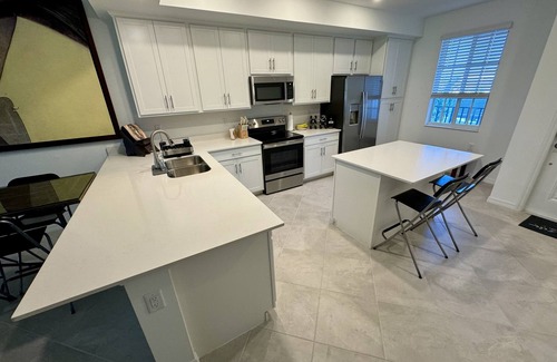 Stay at this brand new and fully furnished home in the heart of The National Golf and Country Club at Ave Maria, a peaceful and charming establishment that offers a resort-like lifestyle. This beautiful property includes two king beds (+1 high-quality inflatable Queen mattress), two full bathrooms, a large, fully-equipped kitchen, and a spacious living room. Other amenities include an in-unit washer/ dryer, 3 large TVs (one in each room), a bicycle and pickle-ball rackets, and a screened-in patio with a gorgeous golf course and lake view.