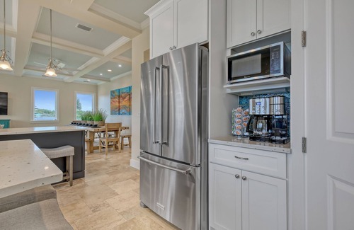 You will find a heated private pool, an outdoor TV and a natural gas Broilmaker barbeque in the lanai area. Also found here are toys for the kids, hammocks for extra relaxing or an afternoon cat nap, plenty of seating outside, along with a stunning custom Eric LaMarr mural (A Kraken!). Throughout the house, you will enjoy the brilliant local Eric LaMarr paintings.