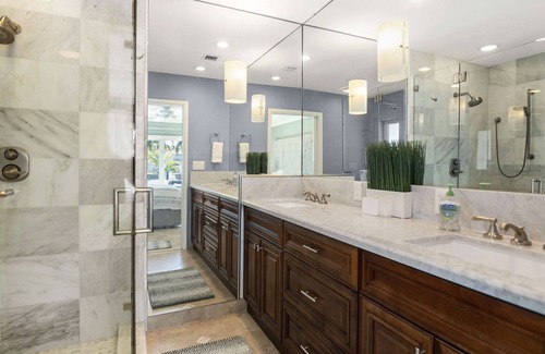 You can quickly change your settings by stepping into the backyard overlooking the water. It offers a private haven with a large saltwater swimming pool, hot tub, and multiple lounge areas. Savor a delicious al fresco meal made in the outdoor kitchen while marveling at the sunsets over the intercoastal waterways. Once the fire bowls light up, turn on the HD projector and have a private movie screening. The options are limitless!