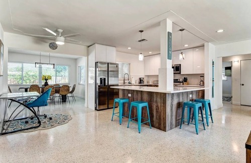 This fabulously updated pool home is just 3 miles from Siesta Key & features a bright open floor plan, 3 separate bedrooms, 2 bathrooms, and a sparkling new heated pool & spa with ledge loungers. Other features include: All new furniture & appliances, inside washer & dryer, high speed internet, TVs in all bedrooms & a dedicated workspaces in the living room and one of the bedrooms. Your family will be close to everything when you stay at this centrally-located place.