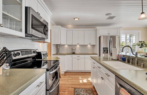 The guest room has a bunk bed ( queen and twin) and a seperate twin. Master bedroom has a king bed and ensuite bath.Located on the ground level is a new laundry room. Swimming pool and spa (salt water) are heated and a weekly pool service is included. Located off the pool area is a large outdoor kitchen with grill. An outdoor shower is also located near the pool area!