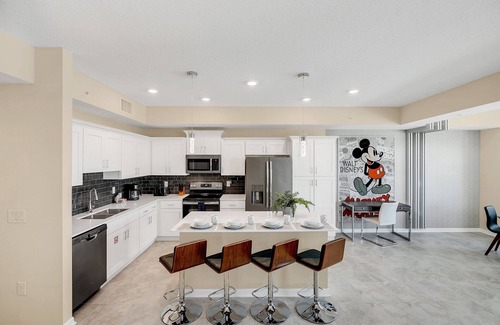 The kitchen features pristine cabinetry, gorgeous granite countertops, modern stainless-steel kitchen appliances, two contemporary pendant lights, and one stunning backsplash, as the center kitchen island doubles as a friendly breakfast nook. In the corner, you’ll find a mural of everyone’s favorite magical mouse, conveniently placed above a sleek desk. Here, you are provided with the perfect place to plan each day, as a whimsical touch of inspiration helps guide the way.