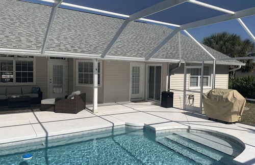 Welcome to your quintessential Florida "Key West" style cottage. Walk inside to spacious 10' ceilings and panoramic views of the full size outdoor pool with views of the on the Pine Valley section of the Long Marsh golf course. With 1900 sq. feet of living and another 1,100 sq. foot Lanai will allow plenty of space for you and your family. All 3 bedrooms have been updated with new bed & bedding. Kitchen is fully stocked with anything you need to grill and chill by the pool. New 62" Minka Aire ceiling fans plus new high efficiency central air will keep you cool year round or just open the front door and use the retractable screen for a lovely breeze. Lounge out back with new high quality outdoor living room furniture or sun yourself on the southern facing loungers. Take a swim year round in our high efficiency brand new heated pool. Evening is fully lit with dimmable programmable LED lighting making you want to stay outside and enjoy the evening under the stars.