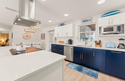 Inside, coastal decor and open living spaces make gathering effortless. The fully equipped kitchen is perfect for whipping up fresh seafood dinners, while the spacious living area invites everyone to relax and reconnect. Step outside to your private oasis with an expansive patio, BBQ grill, fire pit, tiki hut, and room to mingle. It's the ideal spot for cocktails at golden hour and stories under the stars π΄