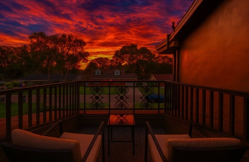 ✹Primary bedroom: Second floor, king-sized bed, 50” smart TV, ensuite bathroom, office w/ private balcony + rocking chairs