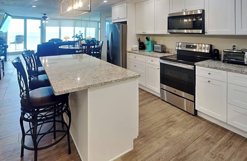 Shores Club 703 has everything you need to stay safety and comfortably right at the beach. Featuring spectacular views and luxurious furniture, this bright and airy beachfront condo sleeps six comfortably and eight with the sleeper sofa. Floor-to-ceiling sliding glass doors and a mirrored wall add a spacious feel while leading you to a wide covered balcony with two access points, perfect for enjoying your morning coffee while you breathe in the salt-tinged air. Inside, sumptuous leather lounge furniture invites you to relax after a day of surfing, parasailing, kayaking or paddle boarding while you catch up on your favorite shows on the large cable TV or update your Instagram courtesy of the free Wi-Fi. Bond over a board game in the cozy dining area, or enjoy a meal of fresh local seafood prepared in the stylish, gourmet kitchen.