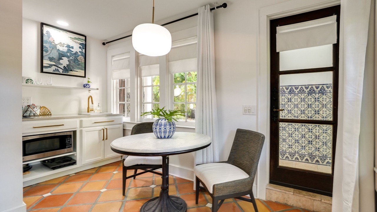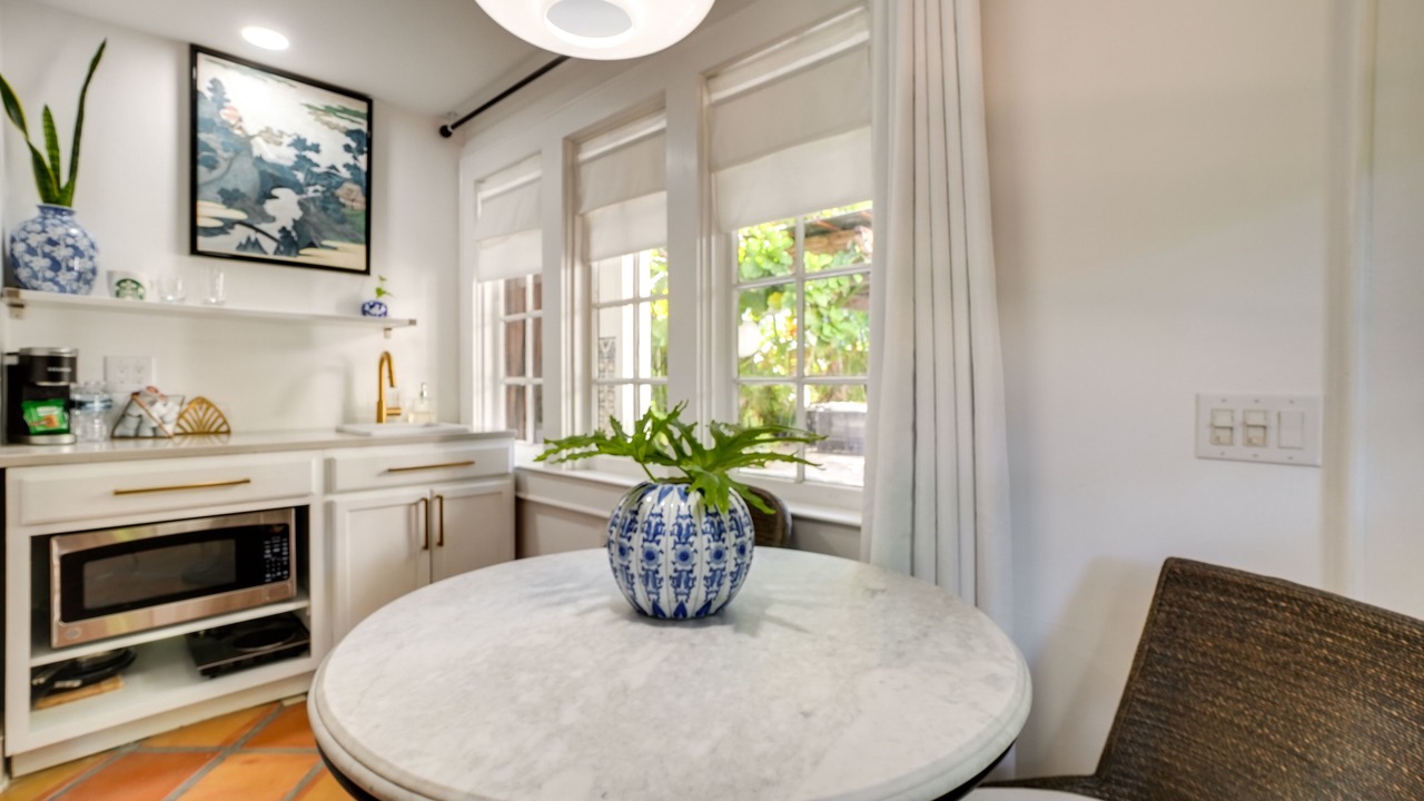 STUDIO INTERIOR: Smart TV, upscale interior decor, breakfast table, marble countertops throughout studio