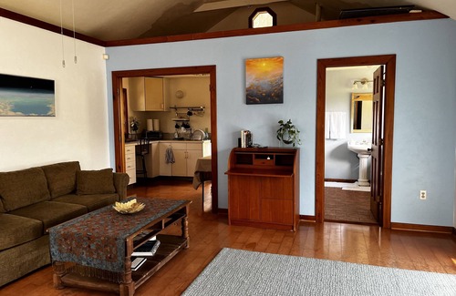 Our large studio apartment with its living/bedroom space, separate kitchen and full bathroom has a double burner hot plate, toaster oven, microwave, large refrigerator, pots and pans, kitchen utensils and coffee and teapot.