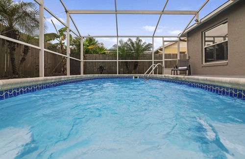 After a day of adventure, relax on a sun lounger, take a dip in your private heated pool, or gather in the living room with a large smart TV. The screened porch overlooks a tropical yard with majestic queen palms, adding to the tranquil ambiance.