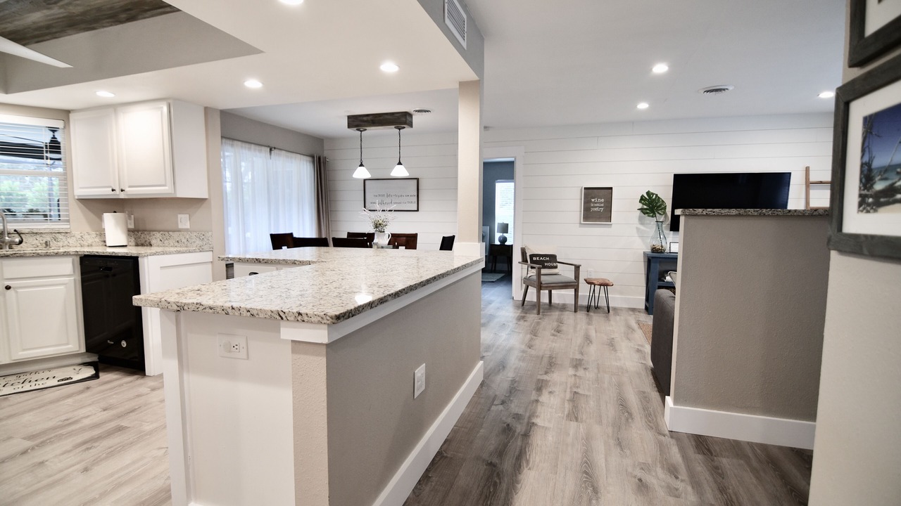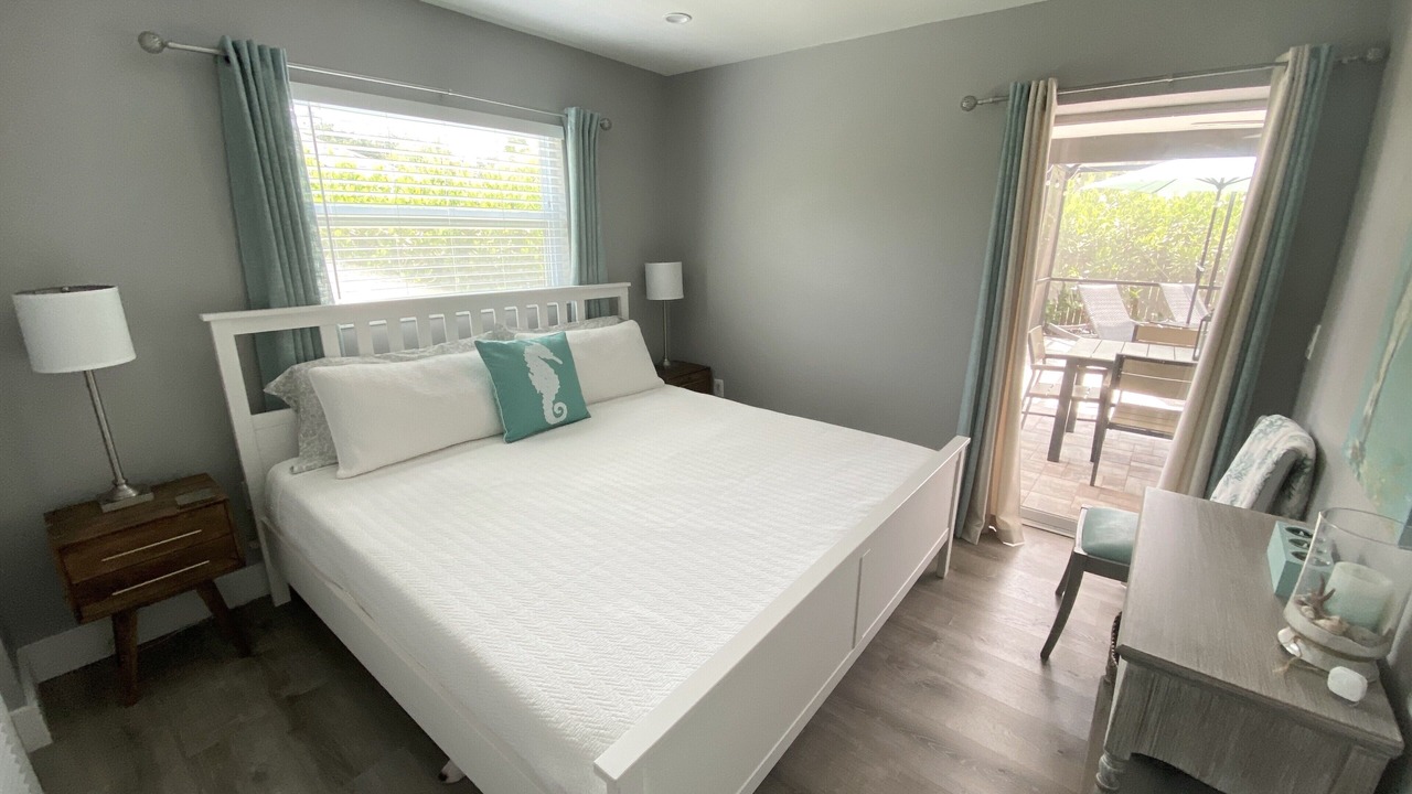 The kitchen is modern and fully equipped should you decide to stay in and make a meal. Master bedroom has a comfortable king size bed with a direct entry to patio/pool area. The second bedroom has a king size bed and this room also has a sliding door which allows for direct entry into pool/patio area! The living room area has a queen sleeper sofa which converts into a full size bed.
