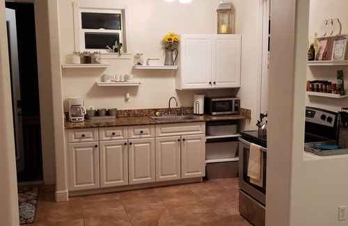 This contemporary apartment has 10' ceilings, and 4 large windows creating a very airy & light ambiance. It has a large step in shower + separate sleeping area with a new queen bed and large closet. The kitchen is has a full size stove, refrigerator and microwave. A washer/dryer is in the garage exclusive for your use. Quality linens, towels, coffee maker + pots/pans and service for 4 are provided; even spices.