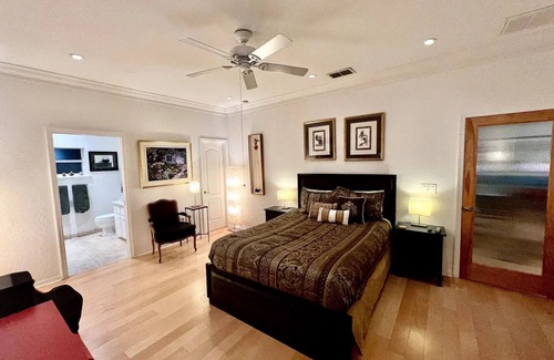 The bedroom suite is beautifully appointed with bright vibrant colors and beautiful art on the walls. Lots of recessed lighting and maple wood floors. A large 55 inch Samsung Smart HDTV with lots of channels and a private Tuscany stone bathroom. Lookout the glass door to a stone patio facing an Orange Grove so close you can touch