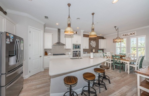 Everything is available to prepare a family feast in our large kitchen. It offers granite countertops, stainless steel appliances, large pantry and island seating area for 4. The kitchen is open to the dining and living area where your whole party can be comfortable, dine together, laugh together and feel at home.