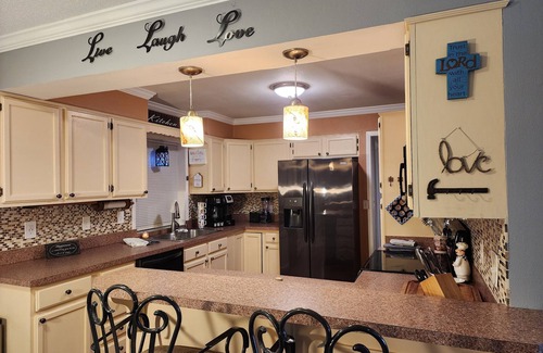 Our fully equipped kitchen has everything you need to prepare delicious meals during your stay. From stainless steel appliances, including a refrigerator, oven, stove, microwave, and dishwasher, to a wide array of cookware, dishes, and utensils, you’ll find it all here. A convenient breakfast bar with seating for two is ideal for quick bites or morning coffee.