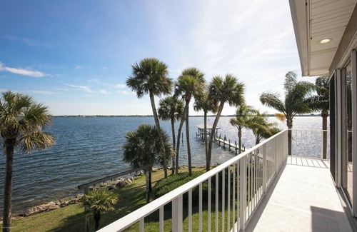 Dolphin Point boasts direct Indian River water views from every room - even the catwalk! Wake up to gorgeous sunrises from your bed. Two matching primary suites upstairs with 32 feet of sliders overlooking river in each. Attached Baths for all 6 bedrooms. Escape to a private peninsula retreat perfect for families or groups looking to relax and recharge. 7 BR / 6 BA vacation haven sleeps 16+. Gather in the spacious theatre/game room, unwind in the heated pool and hot tub, or dine alfresco. Entertain in the gourmet kitchen with wall oven, gas cooktop, built in wet bar, lounge on wraparound balconies, stroll 500 ft of riverfront and enjoy wildlife from the house or dock. 10 minutes to Viera & USSSA Sports Complex. 15 minutes to Beaches, 1 hour to Orlando Theme Parks. QUIET FAMILY RETREAT - NO PARTIES - NO ROWDY GROUPS!