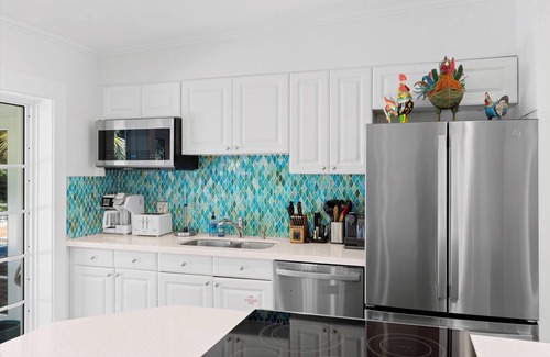 Each of the bedrooms opens to a different part of the yard, extending the private space for each bedroom outside as well. The master bedroom opens to the pool area with two walls of French doors and windows. The master bath features a large tiled walk-in shower. The second bedroom is freshly painted with cool green tones and Key West art set to inspire. The third bedroom has two twin beds that can be also be made as a king. Villa Paradiso is in a very quiet residential neighborhood in close proximity to the beaches on the south side of the island. It is an easy bike ride to Duval Street and even closer to the Casa Marina area. A retreat vacation spot. Bedding: 2 kings, 2 twin beds