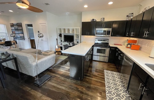 With 3 rooms, including separate bedroom with queen bed, and a spacious open plan living and dining room with a fully-equipped kitchen including stainless steel appliances, you have the amenities of a boutique hotel with the comforts of home. Other features include flat screen TV with cable, DVD, granite and solid surface countertops and surround sound system. A large screened porch with additional seating and dining overlooks a serene forest.