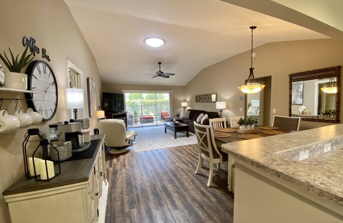 Beautiful Designer home with open floor plan & professional décor throughout. Eat-in-kitchen offers espresso finished cabinetry & breakfast nook with high top table & six chairs with a birds eye view of the Sweetgum golf course. Formal dining with seating for eight, coffee bar with Keurig Duo single serve & carafe coffee maker. The living room has a solar tube to let in the natural light to make it light and bright, opens to a 9' patio door with wonderful screened lanai with outdoor L-shaped sectional seating & 2 additional Rattan chairs which opens to concrete patio with weber electric grill & additional seating. Living room with 60' flat screen & cozy electric fireplace. Owner's suite with queen memory foam mattress, occasional chair, 50' flat screen, walk in closet & bath with dual counter height sinks & walk-in tiled shower with glass block window for natural lighting. Second bedroom with queen memory foam mattress, occasional chair & 40' flat screen. Third bedroom offers a queen bed with credenza (all the games/books are stored here) , occasional chair, flat screen TV, wireless printer & an optional pack-n-play & Cot in closet. Laundry near Owner's suite for convenience that offers front load LG washer & electric dryer, utility sink & more. Guest bedrooms have pocket door entrance for privacy. Front patio with Rattan outdoor seating for 4. 15 minute walk to Brownwood Paddock square & 3 minutes by golf cart. Two seat 2020 gas Yamaha Golf cart available to rent. 20 minutes by golf cart to Lake Sumter Landing, 30 minutes by golf cart to Spanish Springs, 15 minutes to Edna's on the Green by golf cart. 25 minutes to Saw Grass Grove, all with daily live music entertainment. We are near Evans Prairie Golf & Country Club - a 27 hole professional Championship course & 3 nine hole executive courses (many who live here or visit do not golf so don't let that stop you) Two minute walk to Eisenhower Regional Recreation Center. 3 Pools within 1/4 Mi. - (Neighborhood pool age 30+), (Family Pool) and (Sports pool which offers water aerobics, water volleyball, lap pool). Two areas within 1/8m with Pickle Ball, Bocce Ball, Basketball & Shuffle Board Courts. 1 mile to Pinellas Plaza Shopping Center for gas, groceries, liquor & more. This property offers all the luxuries of home with high speed wireless internet/printer and cable TV. It is outfitted with all the necessary appliances, furniture, décor, utensils, blankets, linens, beach & bath towels, and much more. 3 min. by golf cart to the new MVP Athletic Fitness Club in Brownwood Paddock Square and the famous World of Beers. The Villages offer 3000+ lifestyle clubs, 229 Pickleball courts, 711 holes of Golf, 105 pools including Family, neighborhood and sports pools, 107 Recreation facilities, including Regional and Village centers and neighborhood areas.