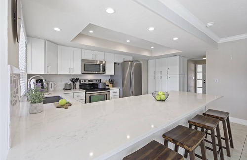 Out on the lanai, the kids will play in the heated pool while you relax on a sun lounger looking out at the turquoise canal lined with palm trees. Life is good and it’s about to get better. The house comes with a gas grill so you can cook up a poolside barbeque and serve it on the family-sized table on the shaded section of the lanai. A pass through window makes it easy to hand ice cold drinks and condiments out from the kitchen.