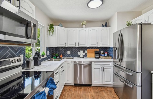 My home features a fully equipped kitchen, a cozy living area with a flat-screen TV, and two, clean, modern bathrooms. The space is decorated and furnished with all the essentials for a comfortable stay, including a coffee/tea bar.
