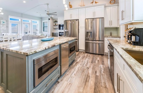AMENITIES: Multiple 65" flat screen TVs in main bedrooms, beautiful well equipped kitchen with granite countertops, double oven, double dishwashers, double microwaves, double refrigerators, gas stove and ice maker, double commercial dryers, sitting area with wet bar, electric fireplace, luxury vinyl flooring throughout, tile in all bathrooms, expansive decks and porches with cable-rail system and polywood furniture, elevator, private pool, fish cleaning station, charcoal grill, under-house concrete parking, no steps between home and private boardwalk to beach.